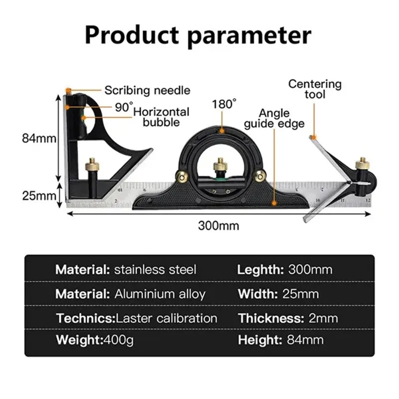 3 In 1 Square Angle Ruler Set Engineer Adjustable Combination Spirit Level Ruler Combination Protractor Measuring Tool Set 300mm